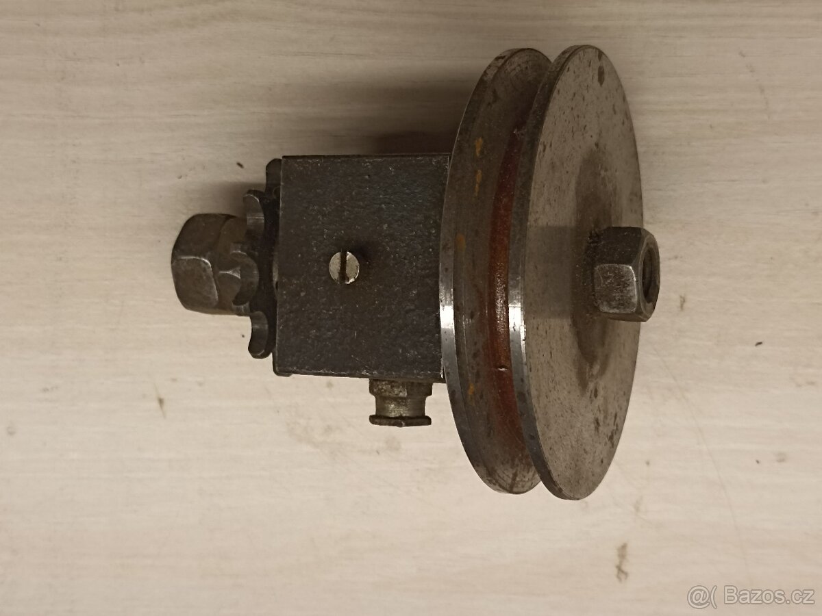 Prodám převod řetězka na klínový řemen. Kostka 50x50x40mm, maznice Stauffer, závity pro uchycení M5, řetězka 12 zubů, tl. 4,8mm, průměr cca 54mm, řemenice klínová průměr 98mm, šířka 17mm, řemen 10. Případné dotazy tel.773754947