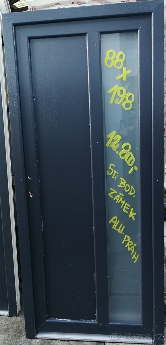 Dveře vchodové nové plastové, dekor antracit ven - bílá dovnitř, š 88 x v 198 cm, měřeno venkovní rozměr rámu (futra), dveře mají boční část sendvičovou výplň z plastové izolační PUR desky - lze zabudovat dvířka pro domácí mazlíčky, vedlejší menší část dveří je