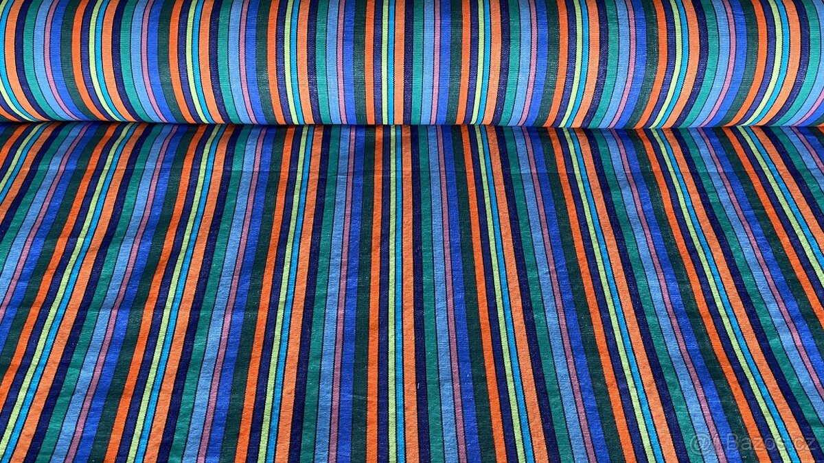 LEHÁTKOVINA , š. 140cm, BA/POP 60/40, modré, zelené a oranžové proužky. Vhodné k potahování lehátek, camping a zahradního nábytku, polsterů, na stříšky, zástěny, markýzy. Barva vyobrazen, cena za běžný metr.