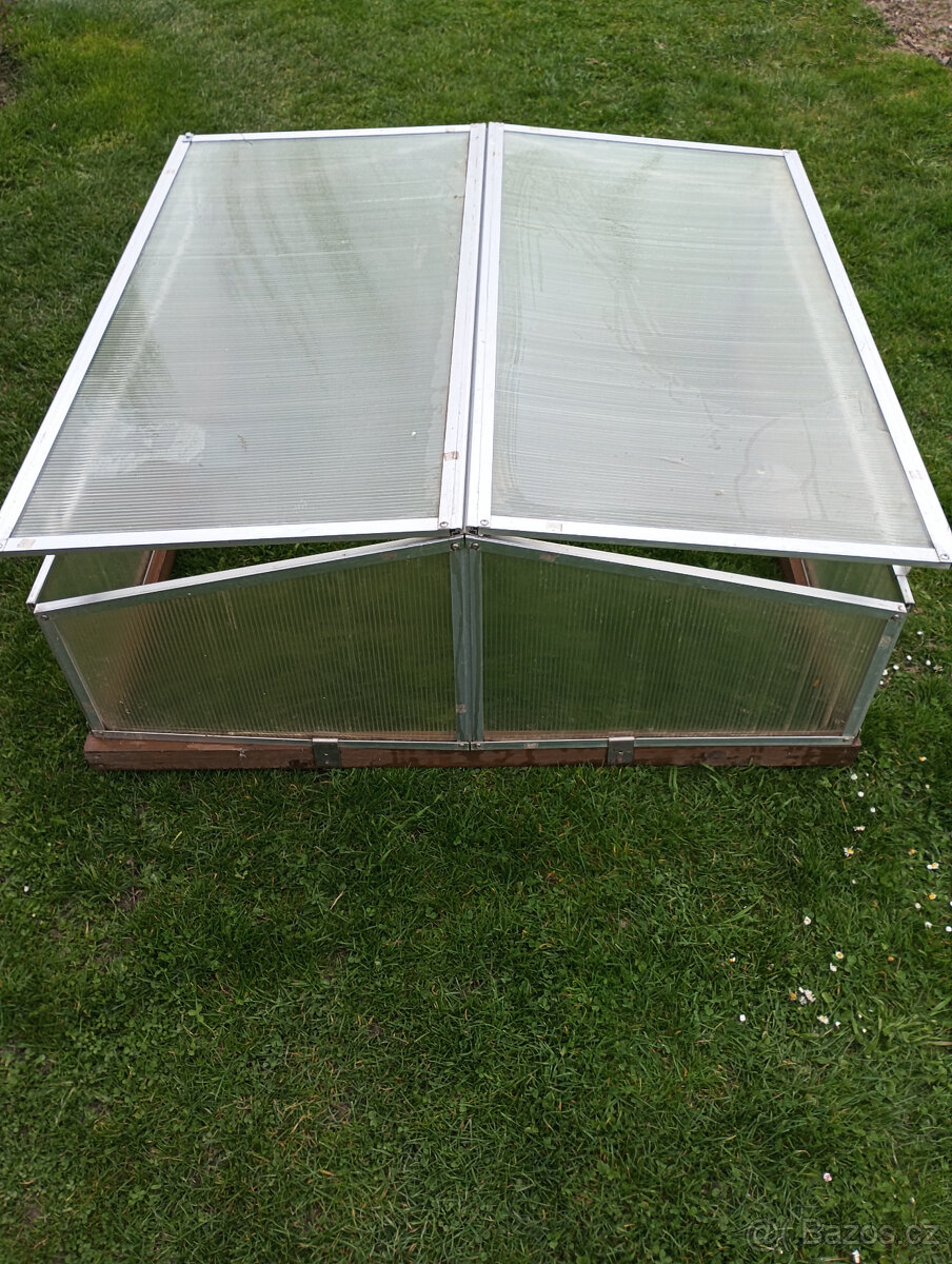 Prodám pařeniště, hliníková konstrukce, polykarbonát 4 mm, opatřeno dřevěnou základnou, rozměr 100x100 cm, možno složit