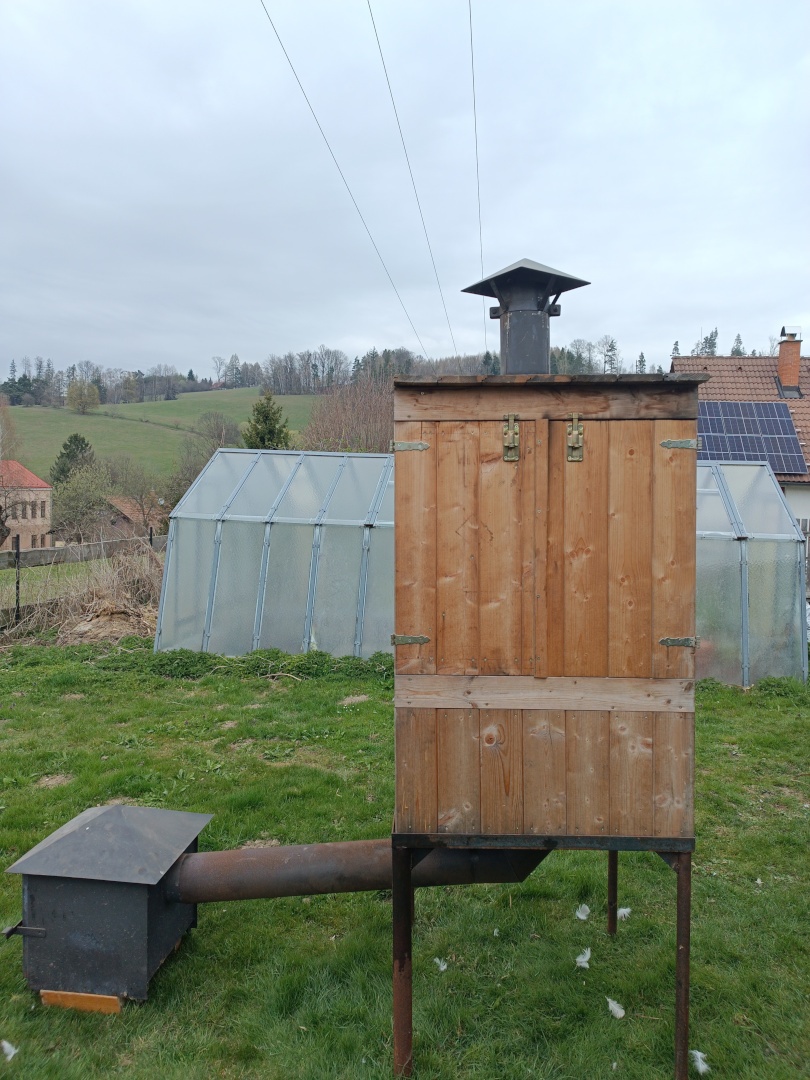 Domácí dřevěná udírna s profi kovovými komponentami. Topeniště, kouřovody, stříška - pořádné kusy železa, žádné plíšky, které se prodávají a proreznou za dva roky. Pořizovací cena topeniště, kouřovodu, kolene a stříšky byla 11 tisíc.