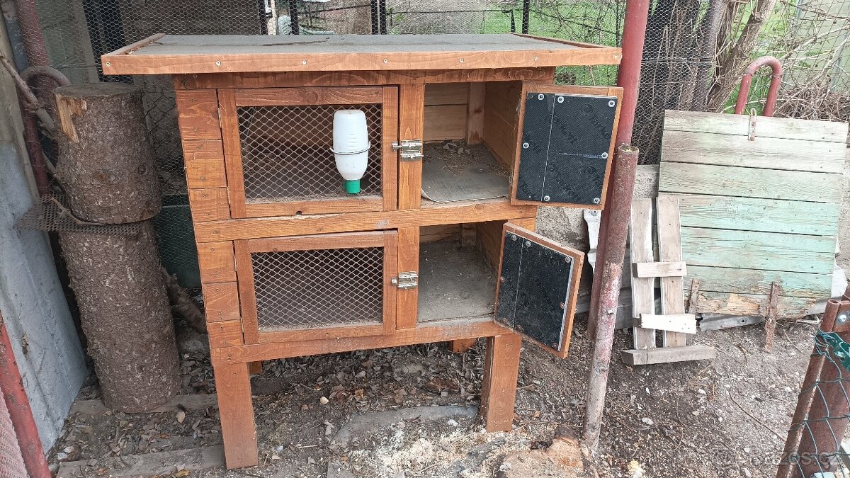 K prodeji nabízím dvou jednotkovou kralíkárnu, každou o rozměru 100x50cm, rozdělenou přepážkou. Jednotky lze propojit odstraněním stropniho/podlahového průchodu. Výška je 140cm, střecha je pokryta asfaltovým pásem. Včetně jesliček na seno a napáječek.