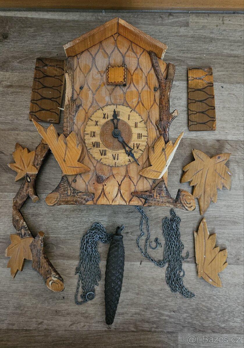 KUKAČKOVÉ HODINY SPADNUTÉ ZE STĚNY CHYBÍ JEDNA ŠIŠKA ,KYVADLO A PŮLKA LISTU ZBYTEK MOŽNO SLEPIT