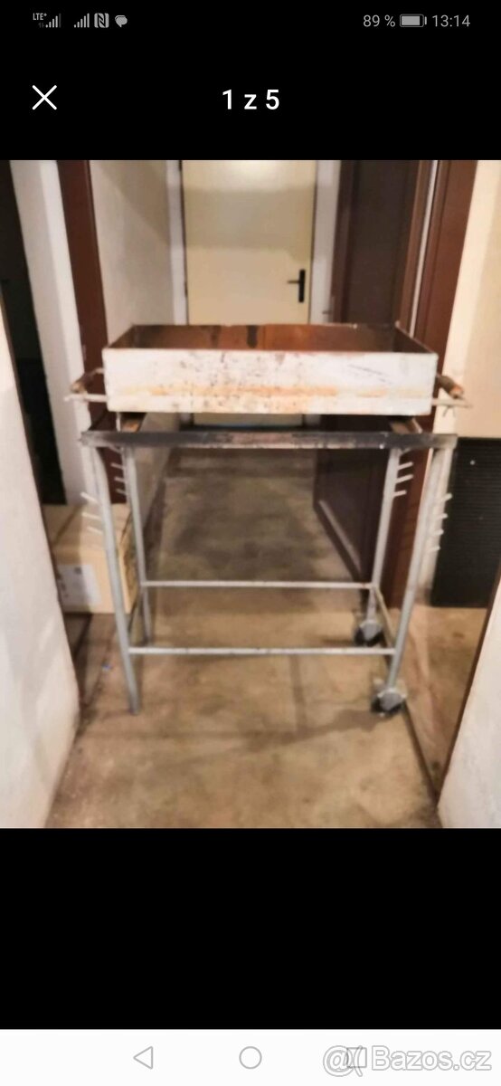 Prodám doma vyrobený polohovatelný zahradní gril s litinovým plátem na dřevěné uhlí, výška 121 cm, šířka 39 cm.