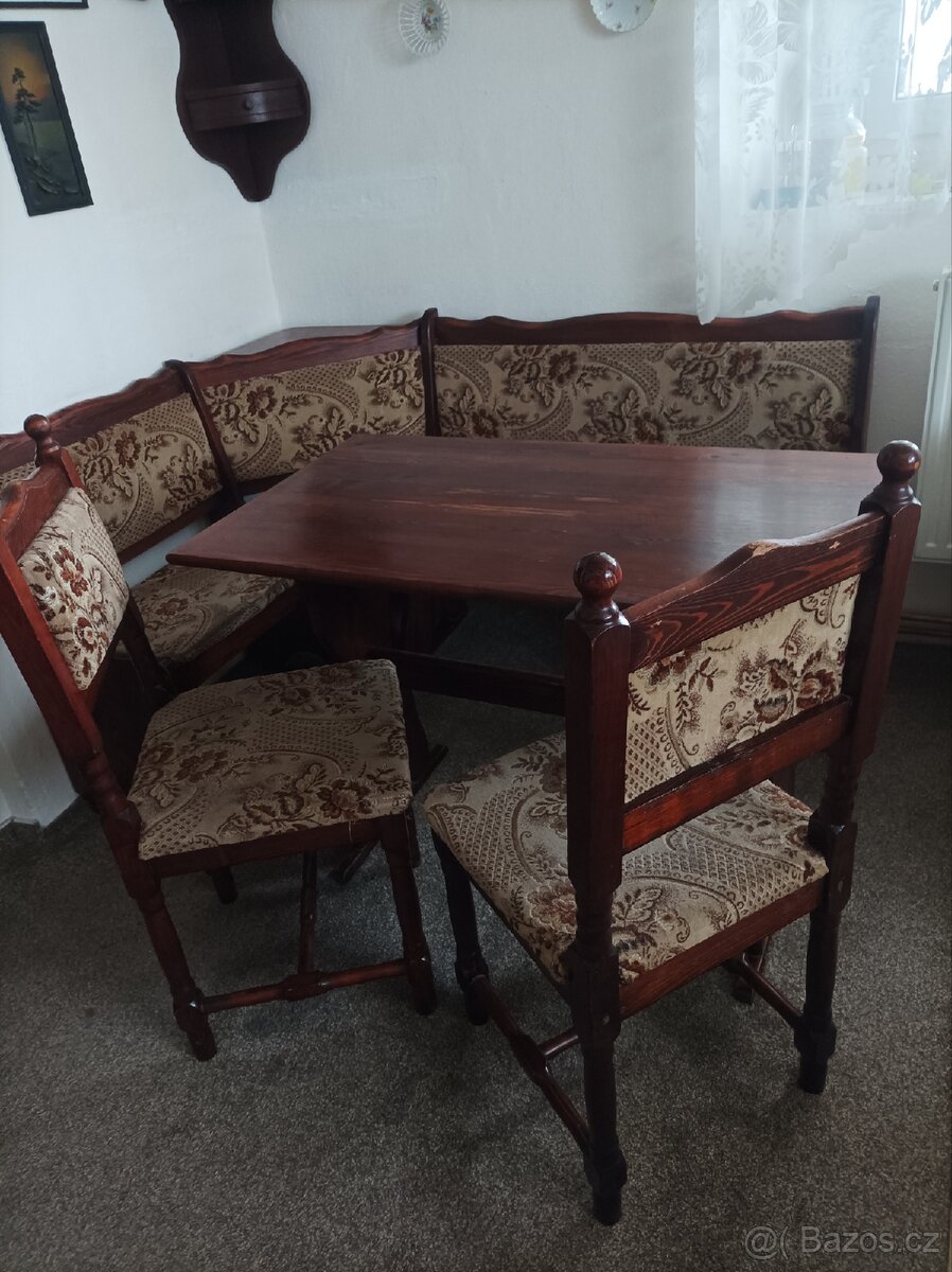 Prodám retro rohovou lavicí s úložným prostorem 150 cm x110 cm +stůl 100 cm x58 cm x74 cm + 2 židle. Vše v dobrém stavu. Vlastní odvoz. Platba hotově při odvozu.