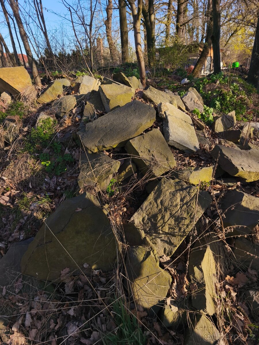 „Prodám přírodní pískovec – vhodný na zídky, skalky, terénní úpravy. Různé velikosti, velké kusy. Možnost naložení bagrem / dovezu na misto