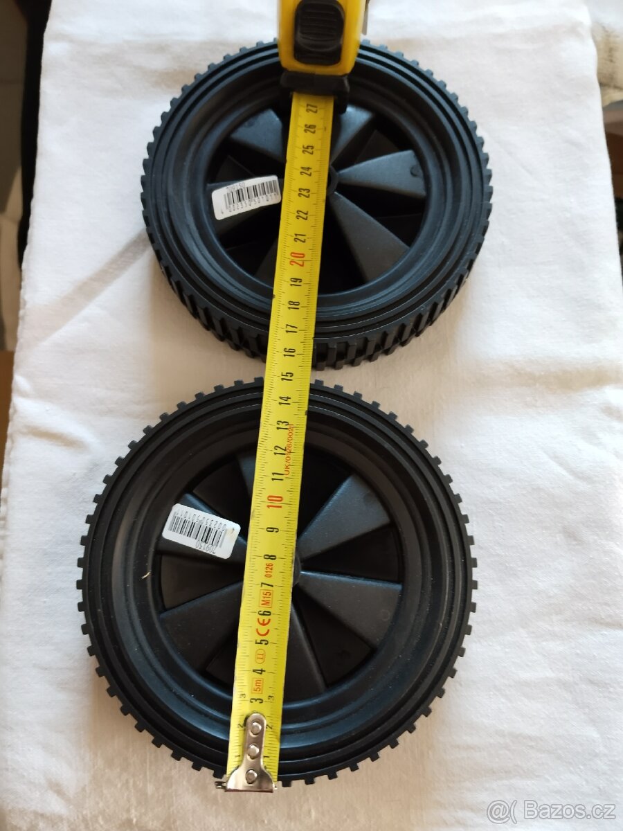 Prodám zcela nová, nepoužitá dvě kolečka, vhodná jsou například k sekačce na trávu, transportnímu vozíku atp. Kolečka jsou z pevného plastu s gumou a hrubším vzorkem po obvodě, míry:velká 150mm/šíře 33mm/středová díra 12mm/ za obě kolečka 200 kč a při osobním převzetí, dám ještě slevu na dopravu.