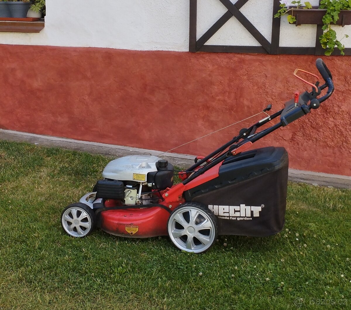 Prodám Hecht 548SW (záběr 46 cm, výkon 2,5 kW) ‒ v motoru to za studena klepe, takže na opravu nebo na náhradní díly.