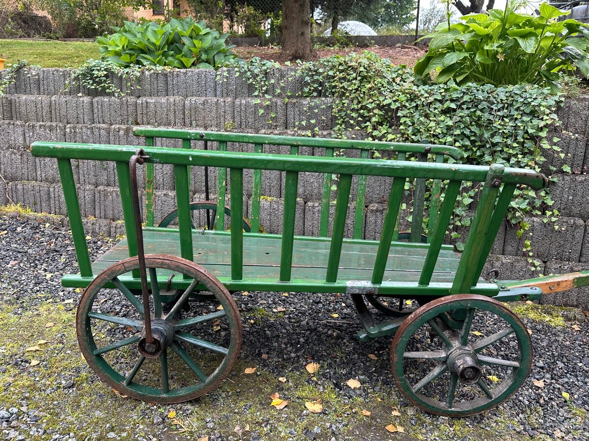 dřevěný vozík žebřiňák - [8.3. 2026]Nabízím pěkný a funkční starý menší žebřinový čtyřkolový funkční vůz