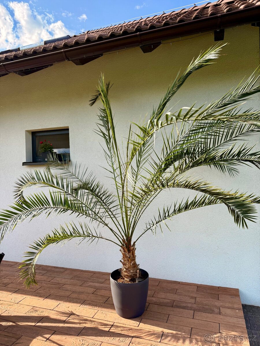 Palma - [20.4. 2026]Nabízím krásnou, velkou, pravidelně hnojenou palmu viz fotografie. Přes léto bývá venku. Výška asi 2,5 m a šířka asi, tam odkud vyrůstají větve - kmen asi 55 cm. Kořenový bal je široký. Když se rozprostřou listy do šíře asi 2,5 - 3 m