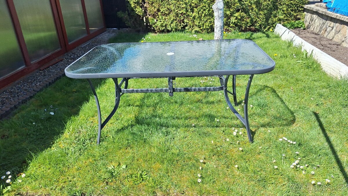 Nabízím zahradní stůl s kovovou kostrou, skleněnou deskou a otvorem pro slunečník. Rozměry 90x150 cm.