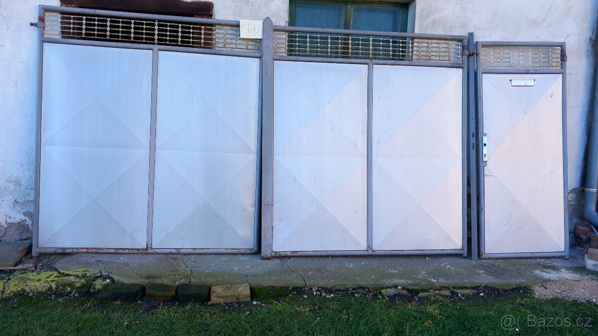 Prodám kovová domovní vrata a dveře. Výška 190cm,celková šířka vrat 350cm, dveře 81×190cm.Rám z kovových trubek, výplň plech alu zinek, další rozměry na fotce. Cena 9000kč.