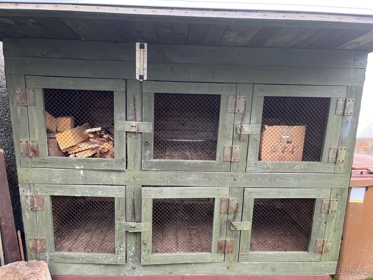 Králíkárna se šesti kotci. Domácí výroba, potažená střešní krytinou i po bocích, oplechování. Pro více info volat.