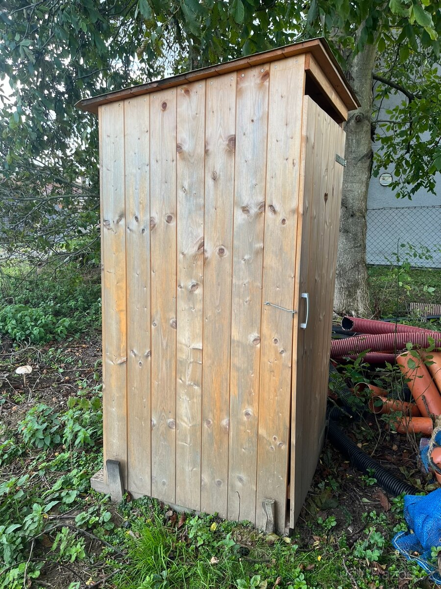 Hezká kadibudka od profi stoláře. Střecha dobrá, neprší do ní. Sloužila nám při stavbě. Málo jetá.
