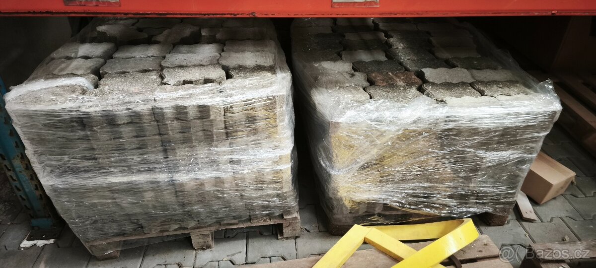 zhruba 1000 ks zámkové dlažby 21x13 síla 6cm. 1Kč za kus. Složeno na 5 paletách.