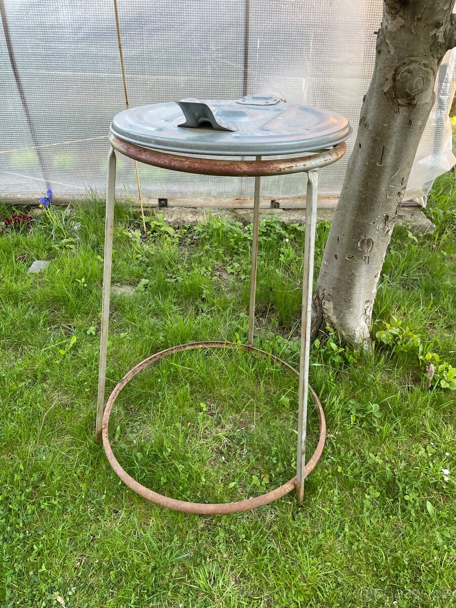 Prodám kovový stojan se třemi nohami a kruhovou základnou. Nahoře je plechové víko.