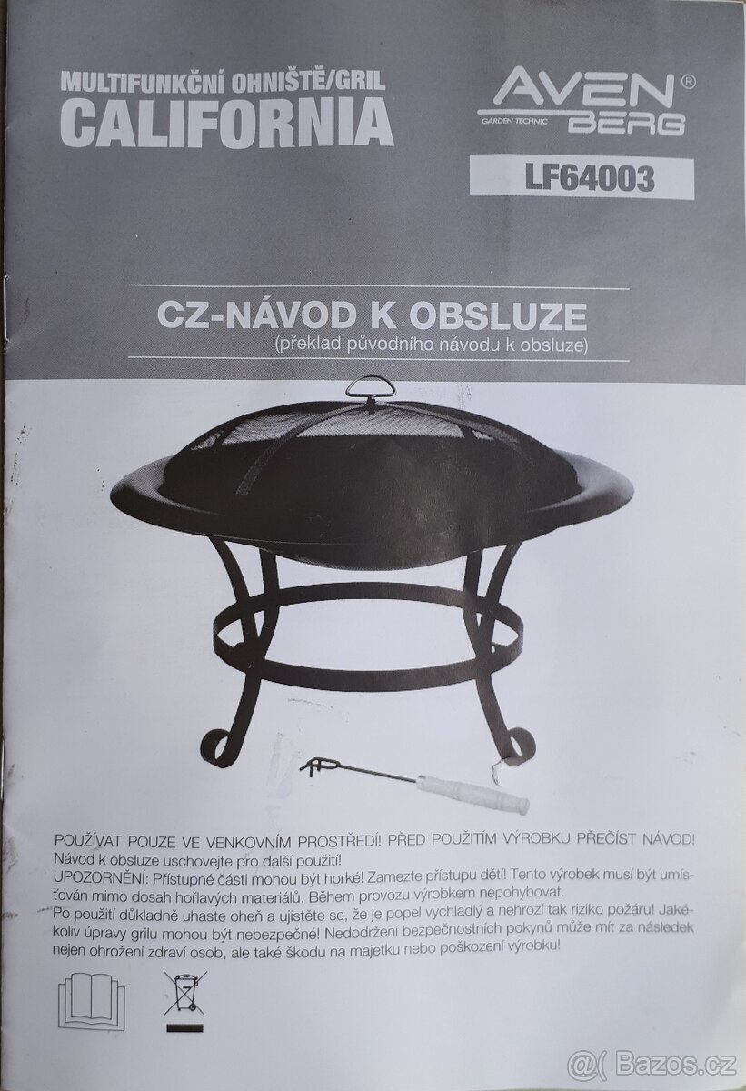 GRIL / OHNIŠTĚ, multifunkční, California/Avenberg, průměr 80cm, 2 obruče, 4 nohy , poklice, pohrabáč, stabilní, český návod, palivová mříž 42cm, grilovací mříž 42cm, nesestaveno, nepoužito, originálně zabaleno, prodej zahrady, spěchá...