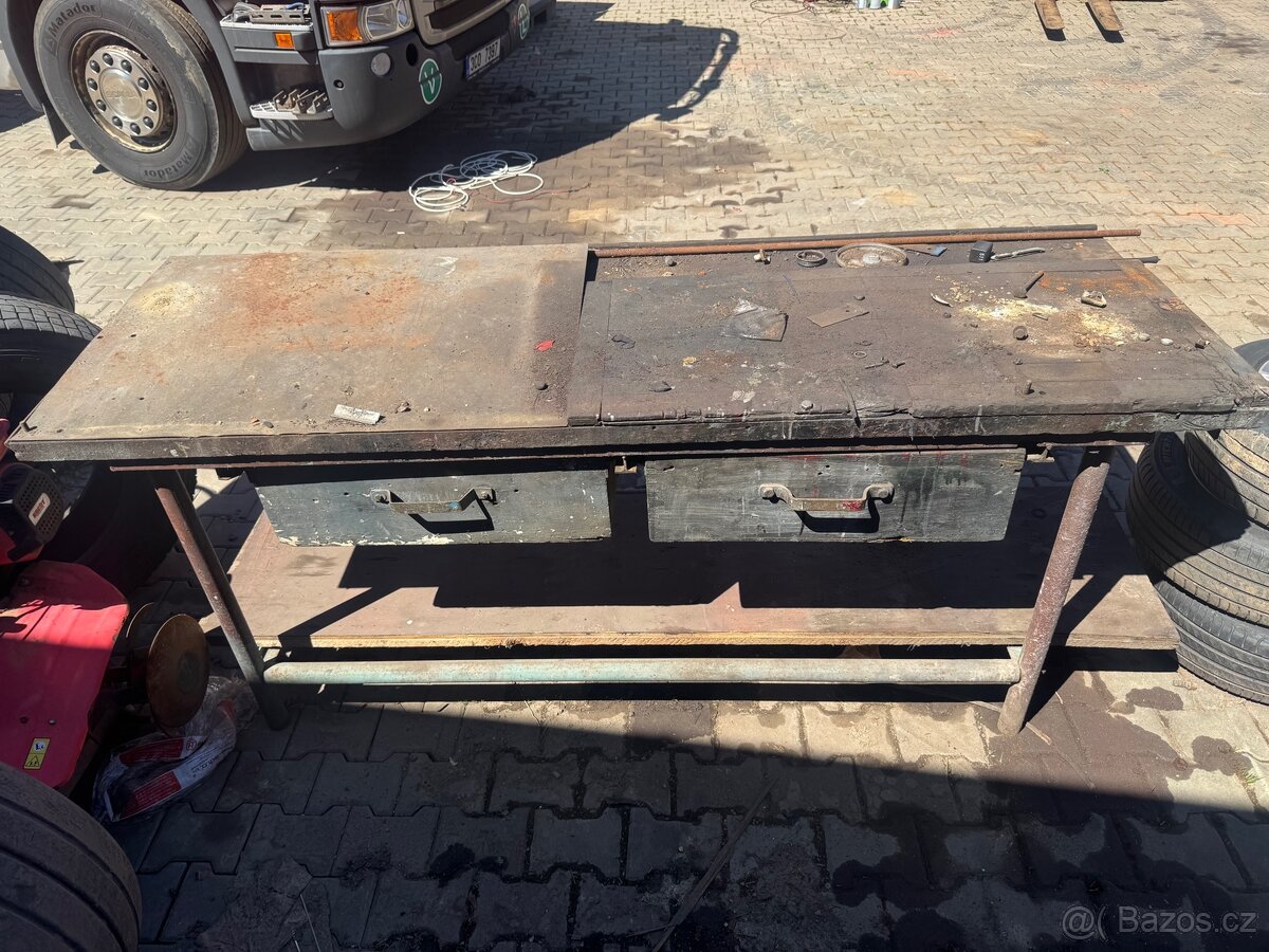 Prodám dílenský ponk. Železná konstrukce. 2x šuplík. Příprava na Svěrák. Rozměry