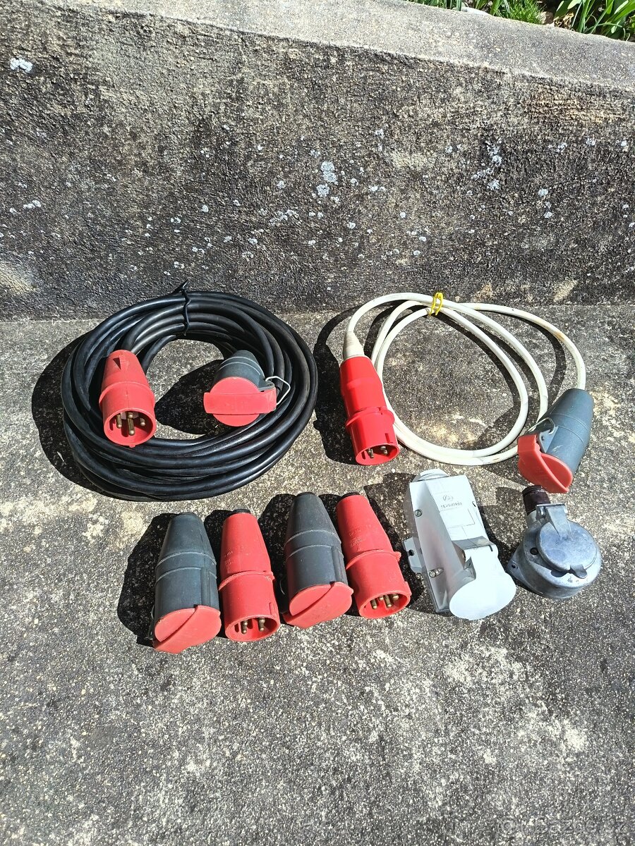 Prodám elektro díly. Prodlužovací kabel délka 15m 380V 32A, prodlužovací kabel 2,5m 380V 32A, pevná zásuvka 380V 32A, 2 volné zásuvky 380V 32A, 2 volné zástrčky 380V 32A, pevná zásuvka 220V 16A. Levně, možno i jednotlivě. Odběr ČB.