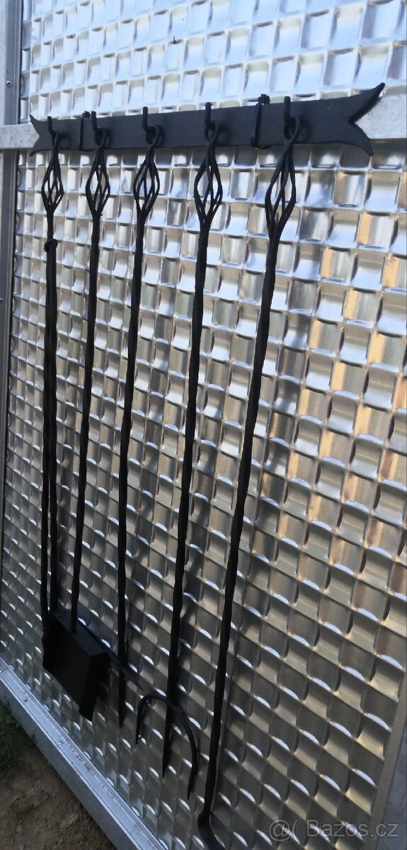 Masivní kované nářadí ke krbu, pět typů o délce 100 cm a konzole na zavěšení 70 cm.