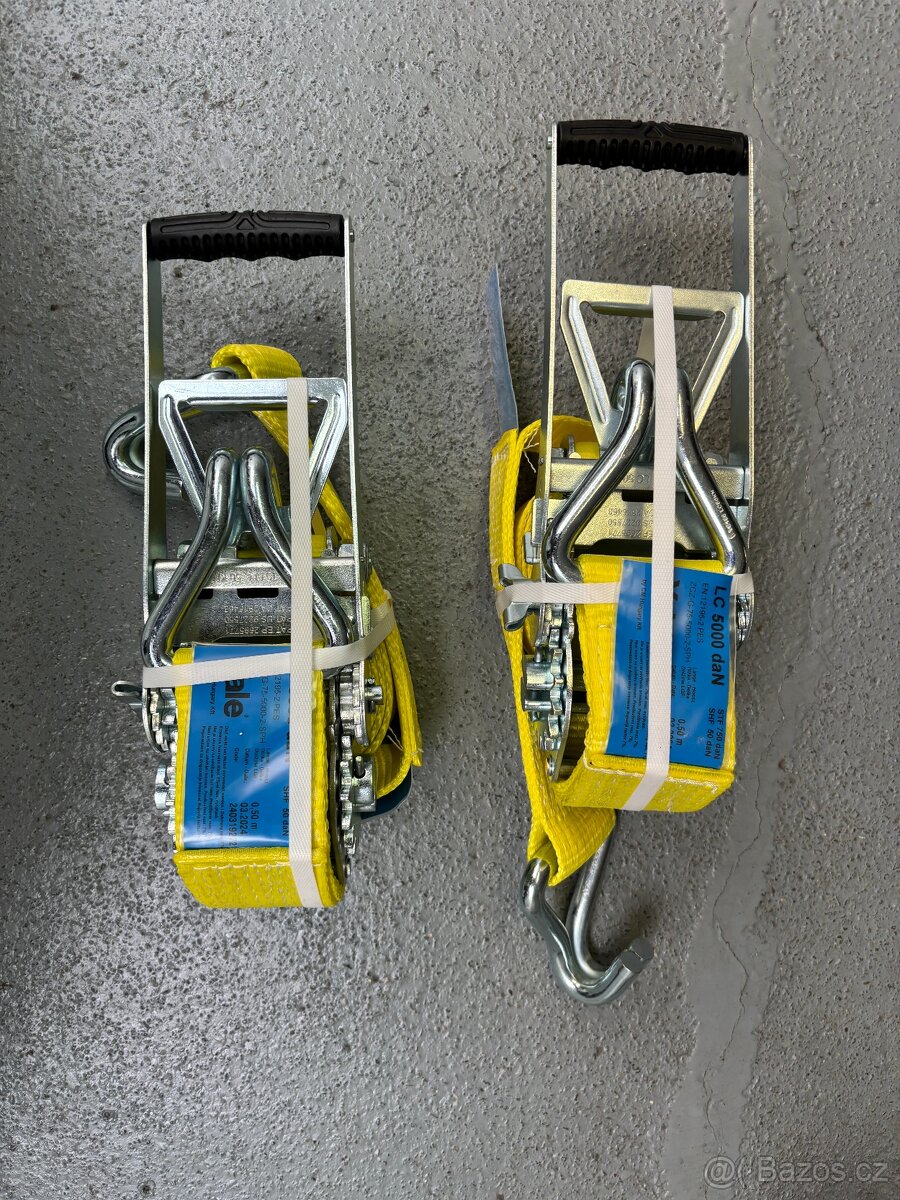Nové upínací pásy s hrotovými háky a délkou 4 m. Cena 500 kč / ks. Cena nového 1500 kč / ks.