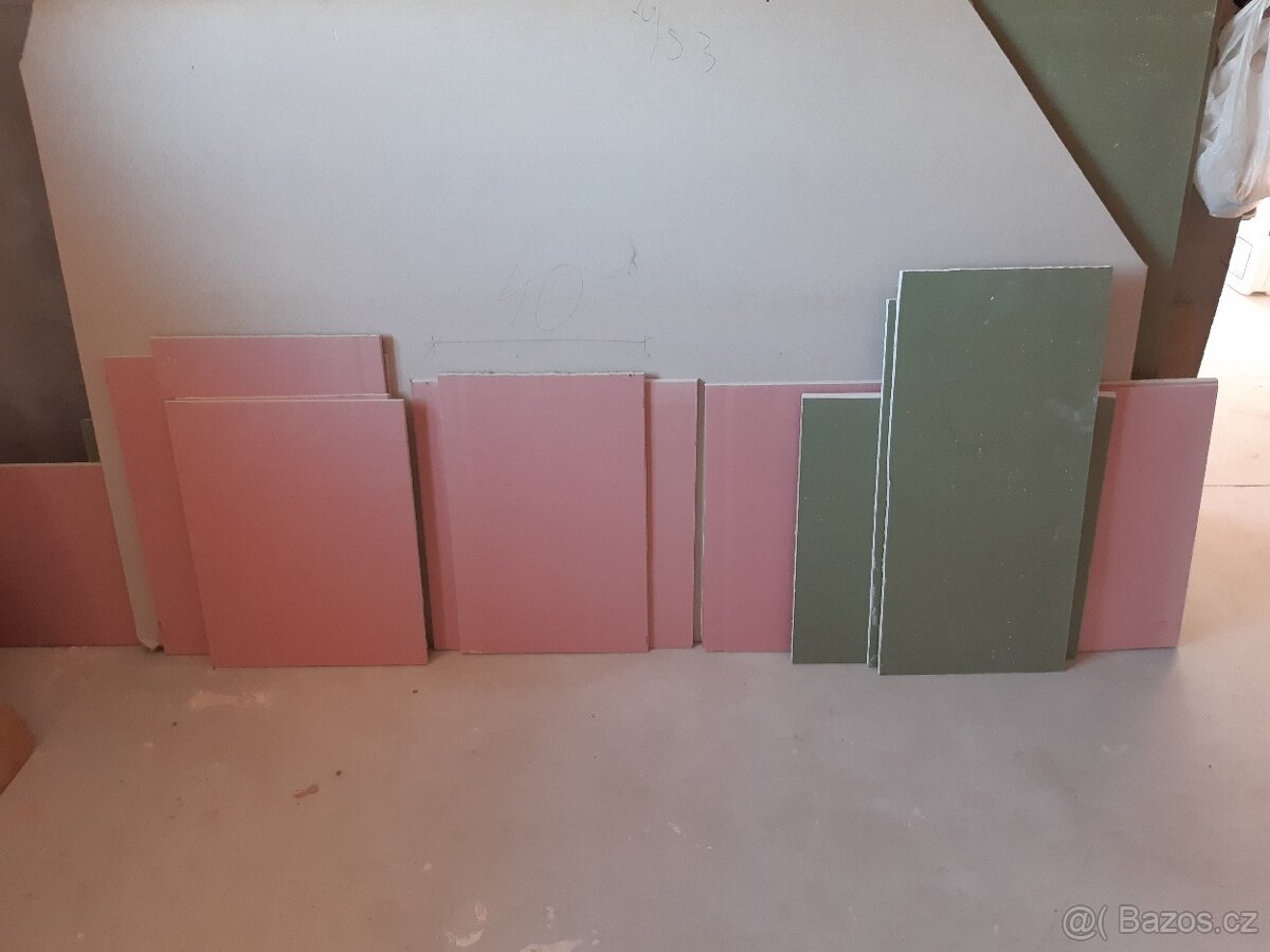 Daruji zbytky sádrokartonu (růžové a zelené odřezky 13 ks), protipožární desky a protipožární desky do vlhka o tl. 12,5 mm. Zároveň máme uloženy venku pod střechou další odřezky (poslední foto).