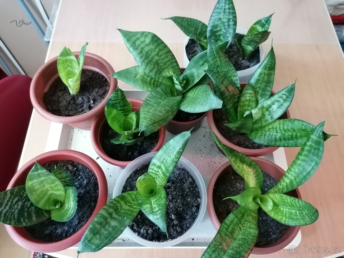 Tchyní jazyk, velmi účinná domácí čistička vzduchu. Odstraňuje všechny toxické látky v prostředí, včetně lepidel z koberců, nábytku atd. Stačí 3 květináče na místnost. Zalévat jednou týdně do misky. Velmi vhodné do dětského pokoje a ložnice.