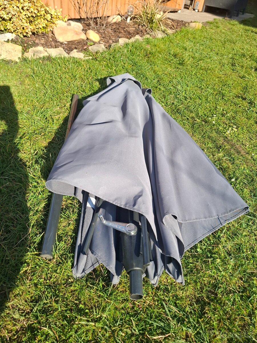Slunečník je nepoužívaný, rozkládání pomocí ráčny, průměr cca 2m.