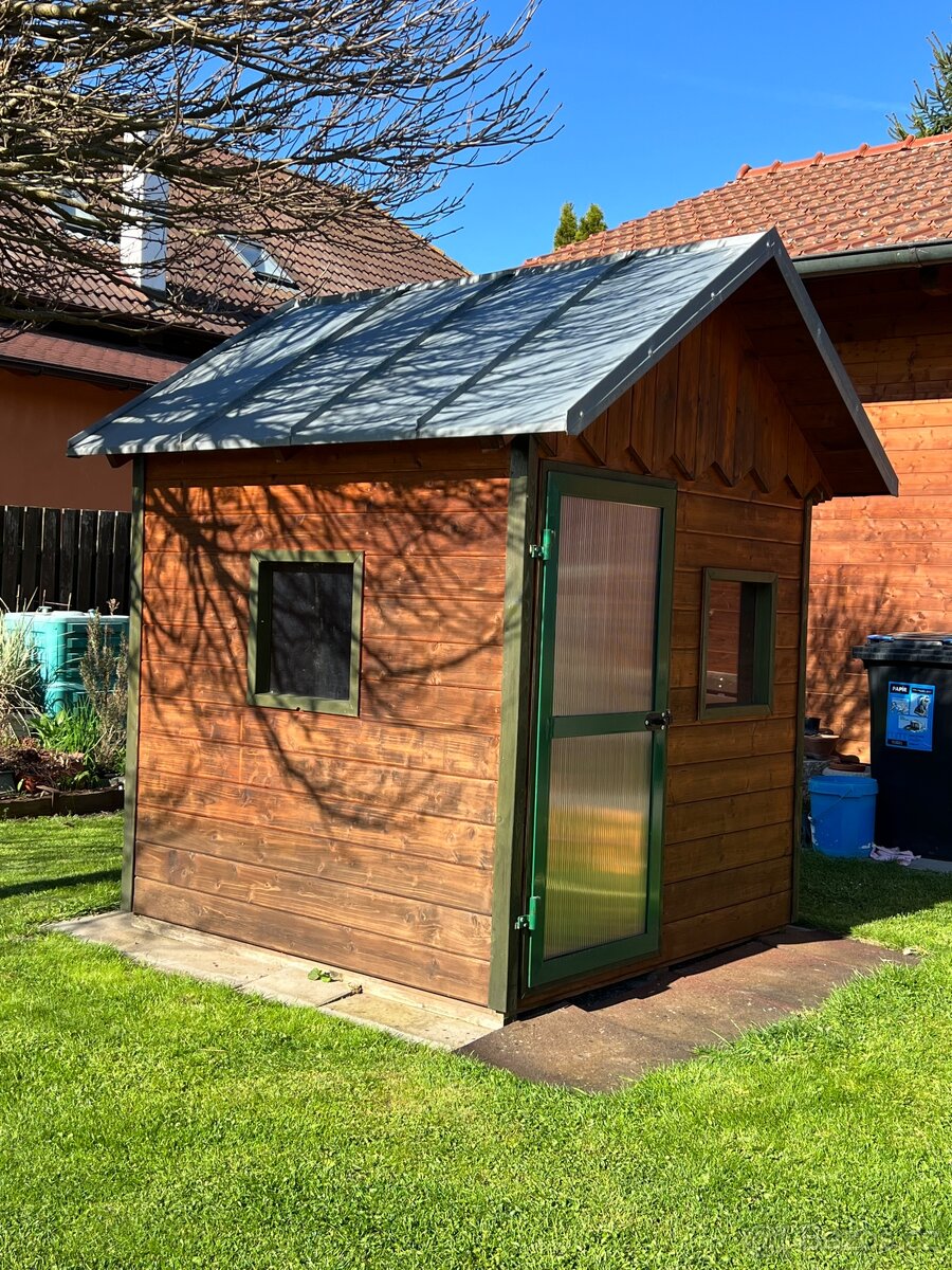 Prodám nepoškozený dětský zahradní domeček. Rozměry vnější 155 x 155 cm. Nově natřený luxolem. Okna opatřeny průhlednými plexiskly. Dodělány dveře. Střecha Titan zinek.