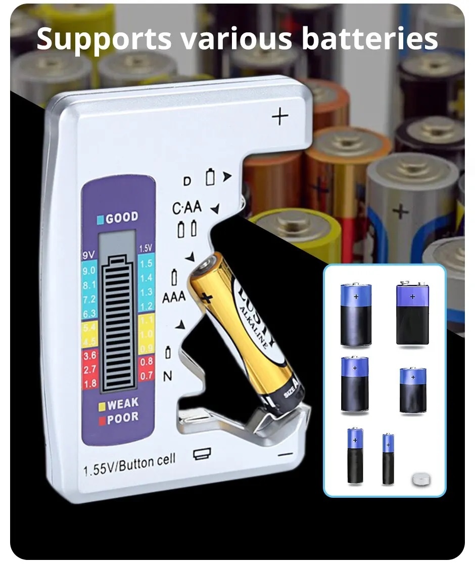Všestranný tester baterií: Tento nástroj je univerzální tester baterií, který je schopen kontrolovat kapacitu různých baterií, jako jsou knoflíkové články C, D, N, AA, AAA, 9V a 1,5V.