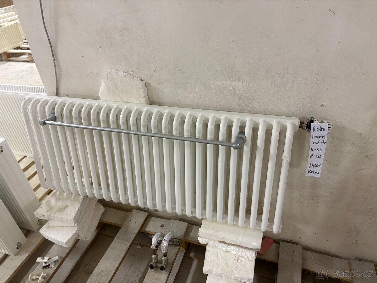 Desingový trubkový, retro radiátor ze spodním středovým připojením bud do koupelny s přidělanou tyčí na ručníky do koupelny nebo bez této tyče do jakěkoliv místnosti včetně držáku, termohlavice a spodního připojovacího šroubení. v TOP stavu viz foto KERMI