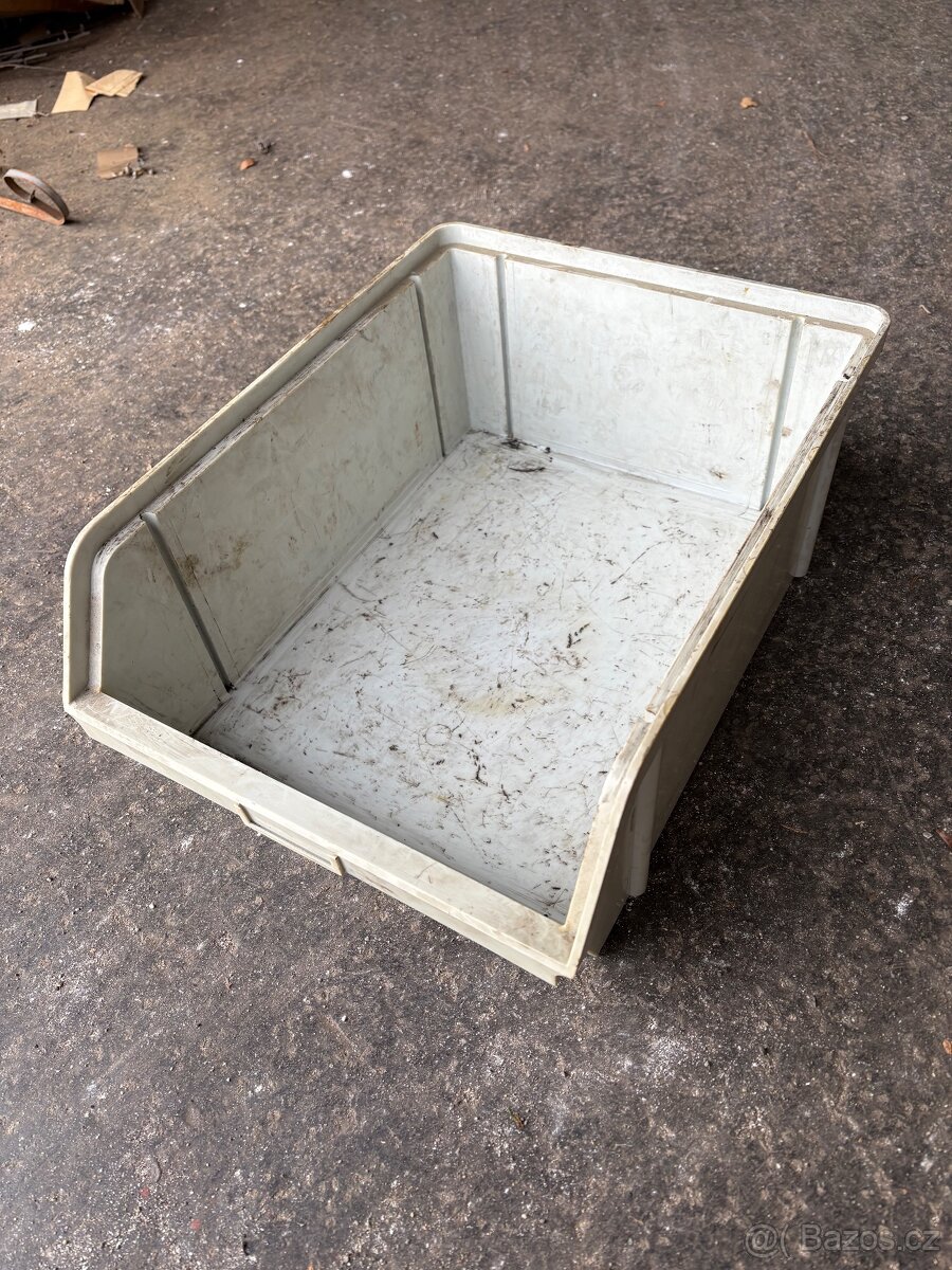 Zkosené bedny plast - cca 25x14x19cm - odběr možný od 50ks - [4.4. 2026]Zkosené plastové bedny množství cca 500ks - možný odběr od 50ks a více. Stohovací hmotnost 185kg. Pouze osobní odběr. 30kč/1 bedna