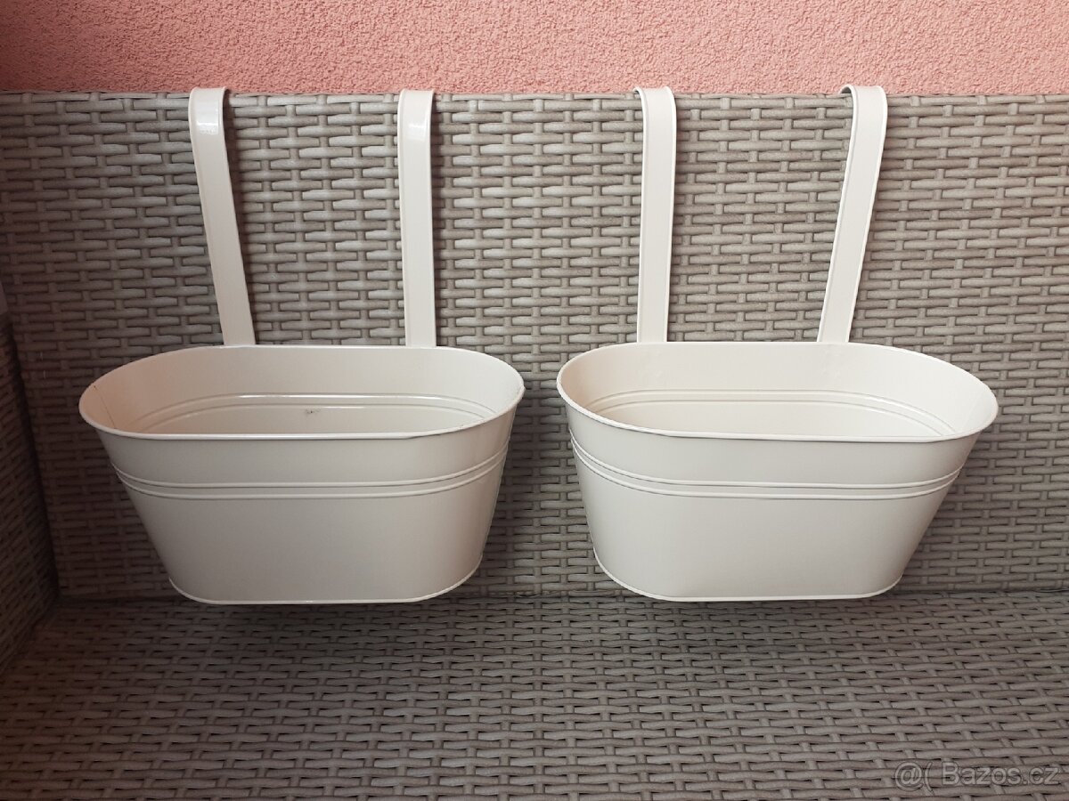 2 x květináče, kovové, béžové, na zavěšení, nepoužité. Š-31, H-16, V-15 (háky 20cm, celková výška 35cm). Cena celkem 200,- Kč.