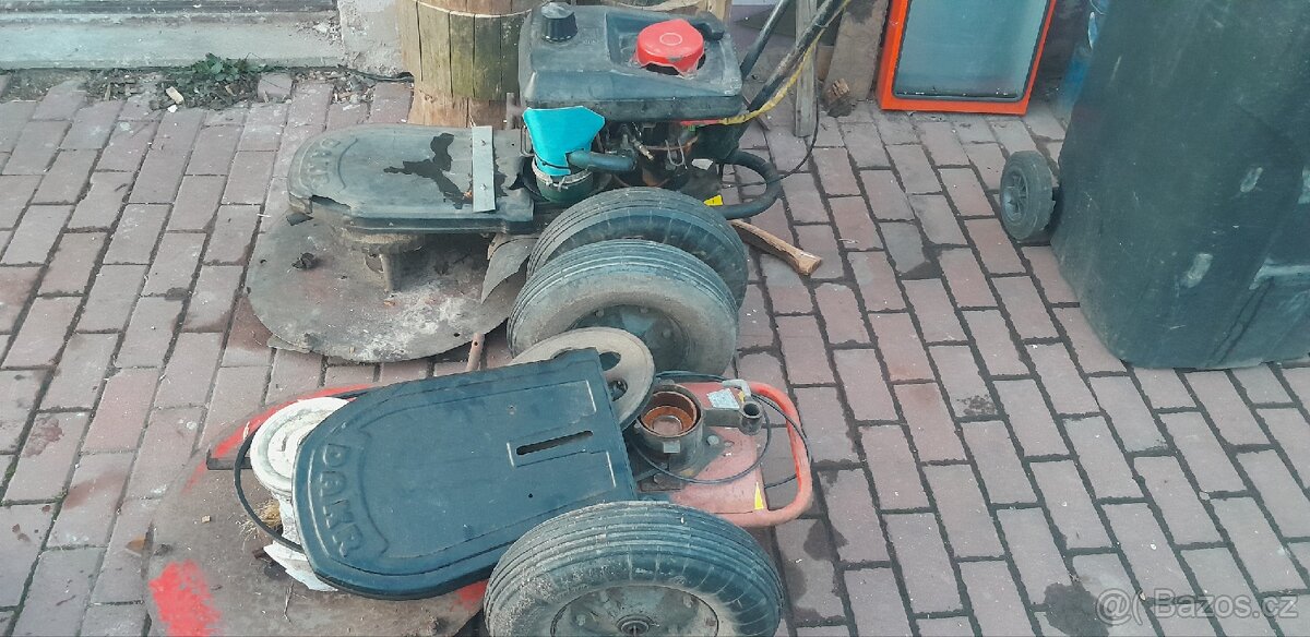 Nabízím na díly jedno a dvou bubnovou sekačku. Jednobubnova s pojezdem za 2000 bez pojezdu za 800 dvoububnova za 2000 motor nutno zprovoznit (vyčistit karburator) cena za kus 2500. Plně funkční dvoububnova s motorem a pojezdy v kolech za 9000 (není na foto