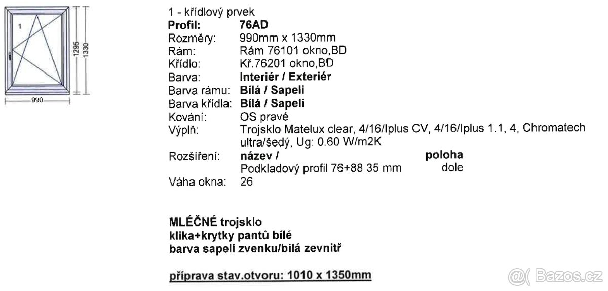Prodám úplně nové okno, špatně zaměřen otvor. Rozměr 990 x 1330 mm, mléčné trojsklo, barva Sapeli (mahagon) zvenku, zevnitř bílá. Kování OS pravé. Více technických informací viz foto. Pořizovací cena 7 000 Kč.
