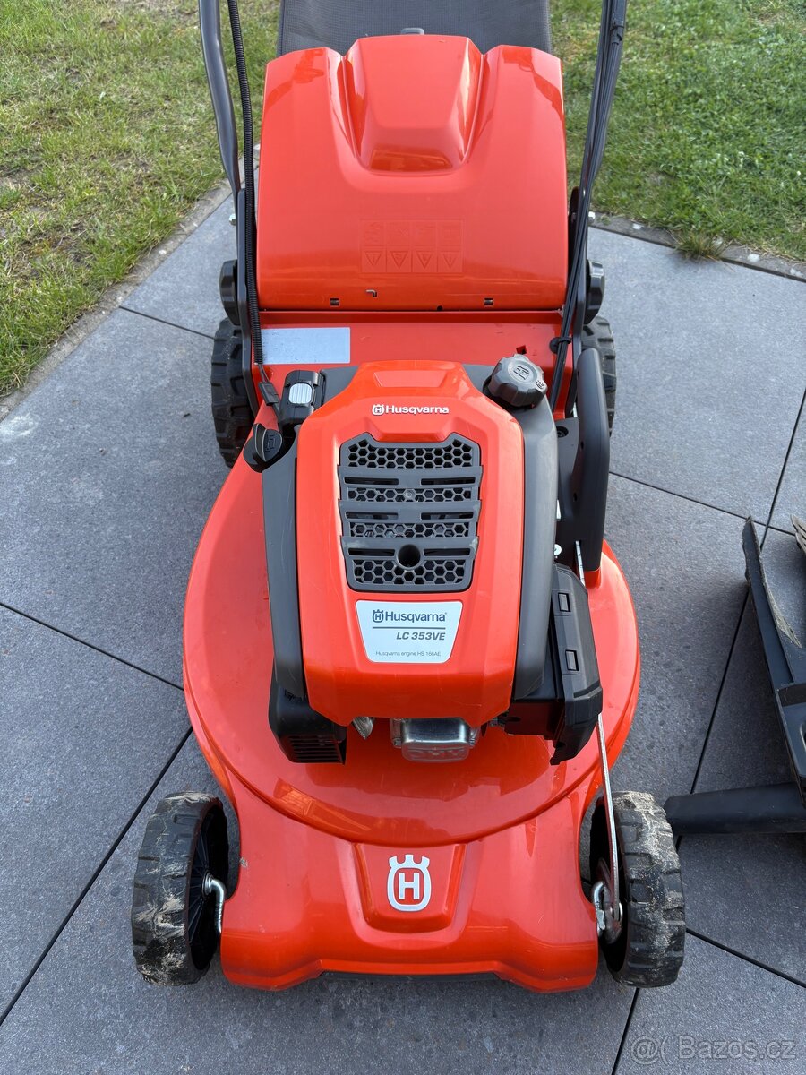 Dvě sezony použitá. Mulčovací sada. Výkonná sekačka na trávu s vlastním pohonem a elektrickým startováním
