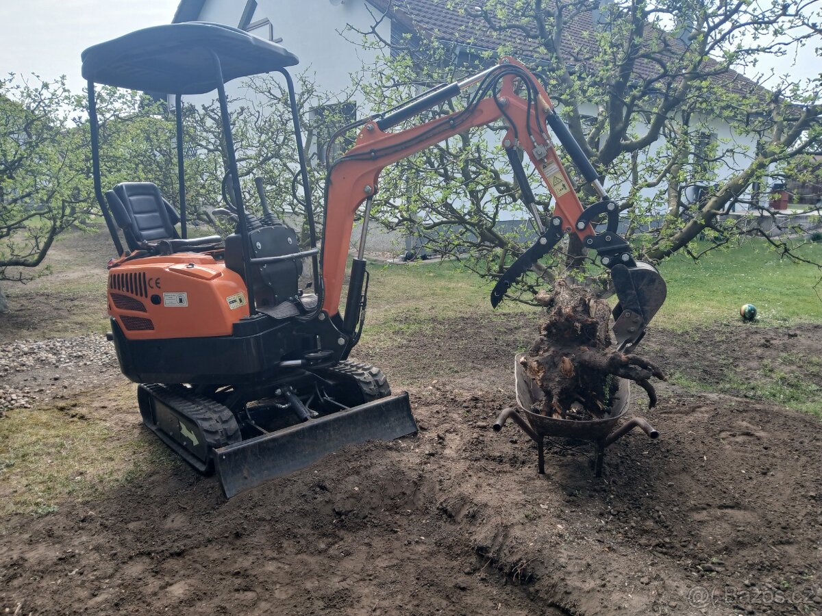 Prodám zánovní bagr KK13 r.2023 motor diesel el. startér palec mimoos.kop. pohodové ovl. joysticky lž.40cm+hydr.svahovka 110cm osvětlení budka stav. viz.obr.