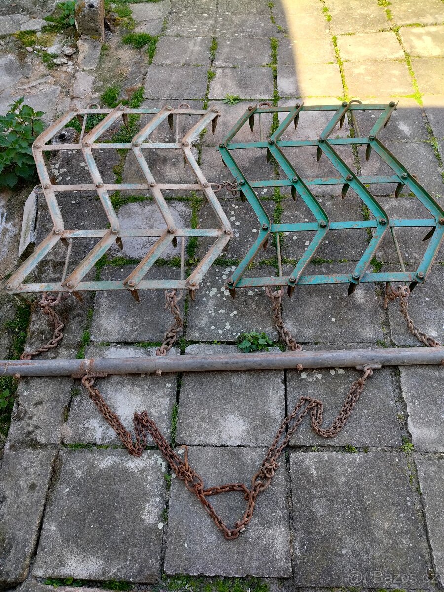 Prodám 2 brány za traktor. Váha jedné brány 25 kg. Skladovány pod střechou. Mírná povrchová koroze. Prodám v kompletu tak jak je na fotce za 2000kč.