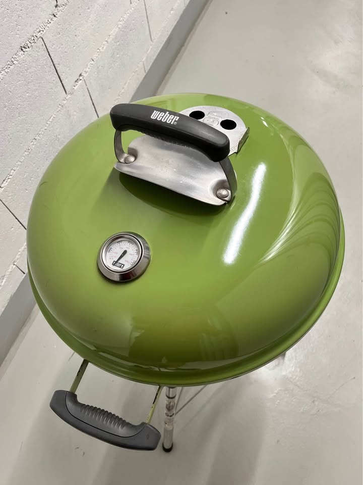 Gril Weber v “lemongrass” barvě připravený na sezónu. Na viku se nachází drobný odštěpek smaltu, který nemá vliv na funkčnost. Lze snadno zatřít vysokoteplotní barvou. Gril je pripraven k vyzvednutí na Praze 9 - Hloubětín.